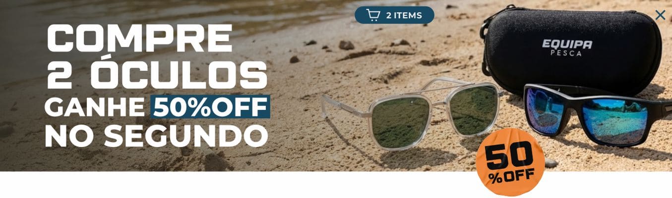 Ao adicionar 2 óculos polarizados ao carrinho podendo escolher quaisquer modelos, o desconto de 50% é aplicado automaticamente no segundo item.